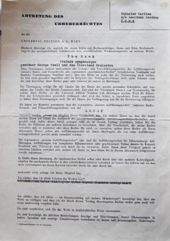 Smlouva mezi Bohuslavem Martinů a Universal Edition o postoupení neomezených autorských práv nebo výhradního práva na užití Martinů díla SKÁLA, věnovaného Georgi Szellovi a Clevelandskému orchestru. Smlouva zmiňuje tzv. "kleine Aufführungsrechte", týkající se rádiového, televizního a filmového uvádění tohoto díla, kterými disponuje American Society of Composers, Authors and Publishers [ASCAP]. Na druhé straně smlouvy je přesně definován podíl Martinů na příjmech z využití díla.