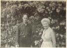 Bohuslav Martinů v kostkované košili a Charlotte Martinů ve světlých šatech stojící před kvetoucími keři