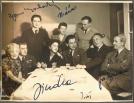 Bohuslav Martinů a Charlotte u Macháčků o Vánocích. Zleva Marie Macháčková, neznámý mladík, Egon Hostovský, neznámá mladá žena a mladý muž, Charlotte Martinů, Alén Diviš, Bohuslav Martinů a Josef Macháček
