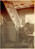 Bohuslav Martinů wearing only trunks writing at table in room inside wooden house, stone fireplace at side, staircase behind
