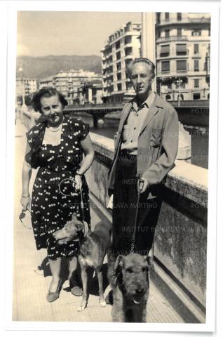 Bohuslav Martinů a matka (?) Olgy Schneeberger se psy na vodítku na nábřeží ve městě