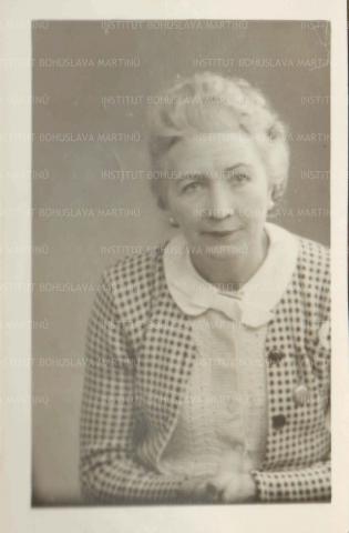 PopisPortrétní fotografie sedící Charlotte Martinů v kostkovaném kostýmu