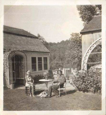 PopisCharlotte a Bohuslav Martinů sedící u stolku v zahradě před jejich domem v Ridgefieldu, pod stolem leží bílý psík