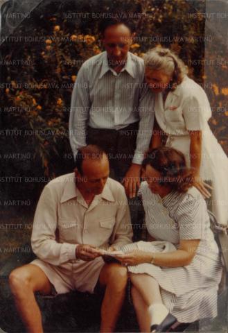 PopisBohuslav a Charlotte Martinů stojící a sklánějící se nad Bernardem Wagenaarem a neznámou ženou sedícími na lavičce v zahradě