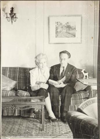 Bohuslav Martinů reading book and Charlotte Martinů looking into camera, both sitting on sofa in their apartment in New York