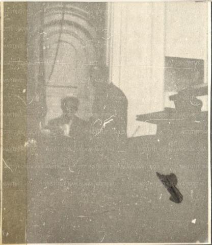 PopisNezřetelný snímek Bohuslava Martinů a dalšího muže snad na podiu koncertní síně