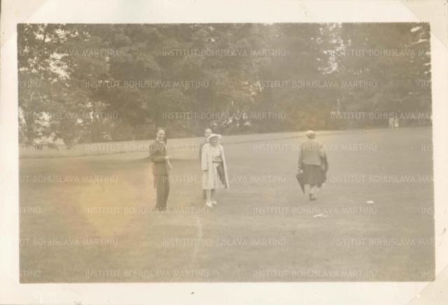 Bohuslav Martinů and Bernard Zighera with raincoats over arms and Charlotte Martinů with closed umbrela standing on grass in park