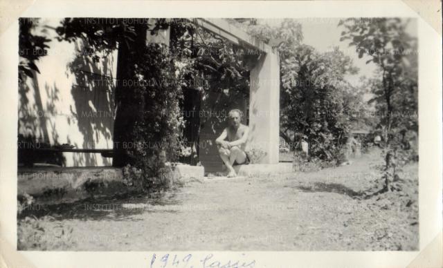 Bohuslav Martinů wearing only trunks sitting on socle of pergola in doorway of house