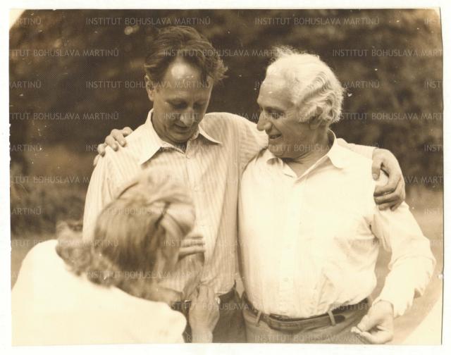 Bohuslav Martinů and Mario Korbel arms round shoulders, Charlotte Martinů buttoning Martinů's shirt