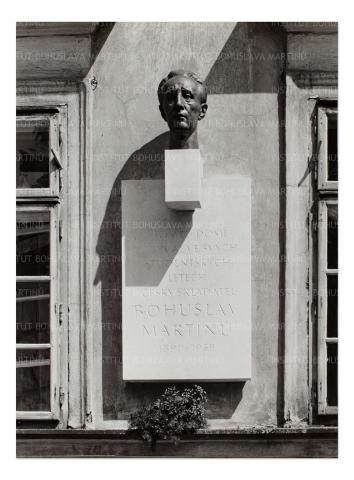 Pamětní deska s bronzovou plastikou Bohuslava Martinů, realizace na domě čp. 512 Na Kampě, Praha
